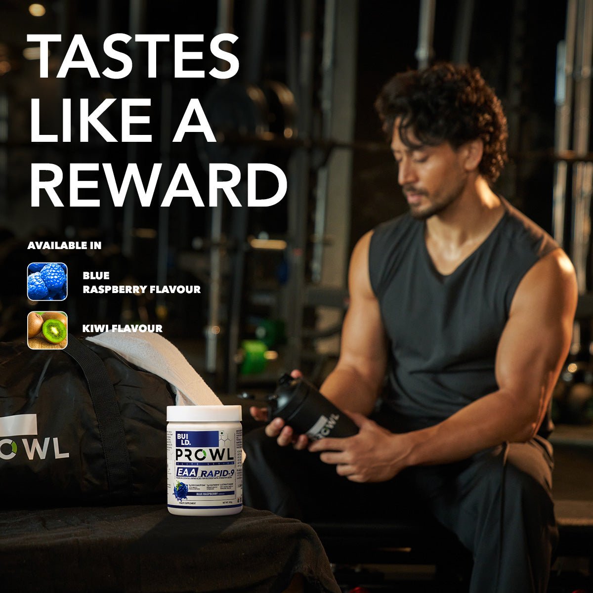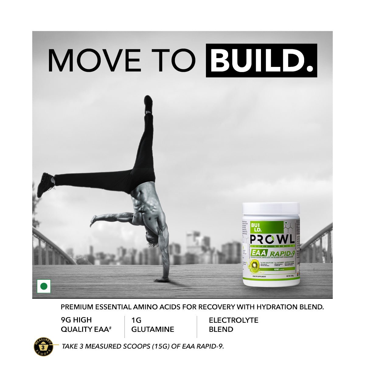 BUILD. PROWL EAA Rapid-9 is a scientifically designed and manufactured product that contains all 9 Essential Amino Acids in a blend packed with other micronutrients that aids in faster muscle protein synthesis while also lowering fatigue and soreness. It consists of an essential electrolytes blend that helps in faster recovery post workout providing a unique blend of sustained energy, rehydration, and muscle recovery in one drink.