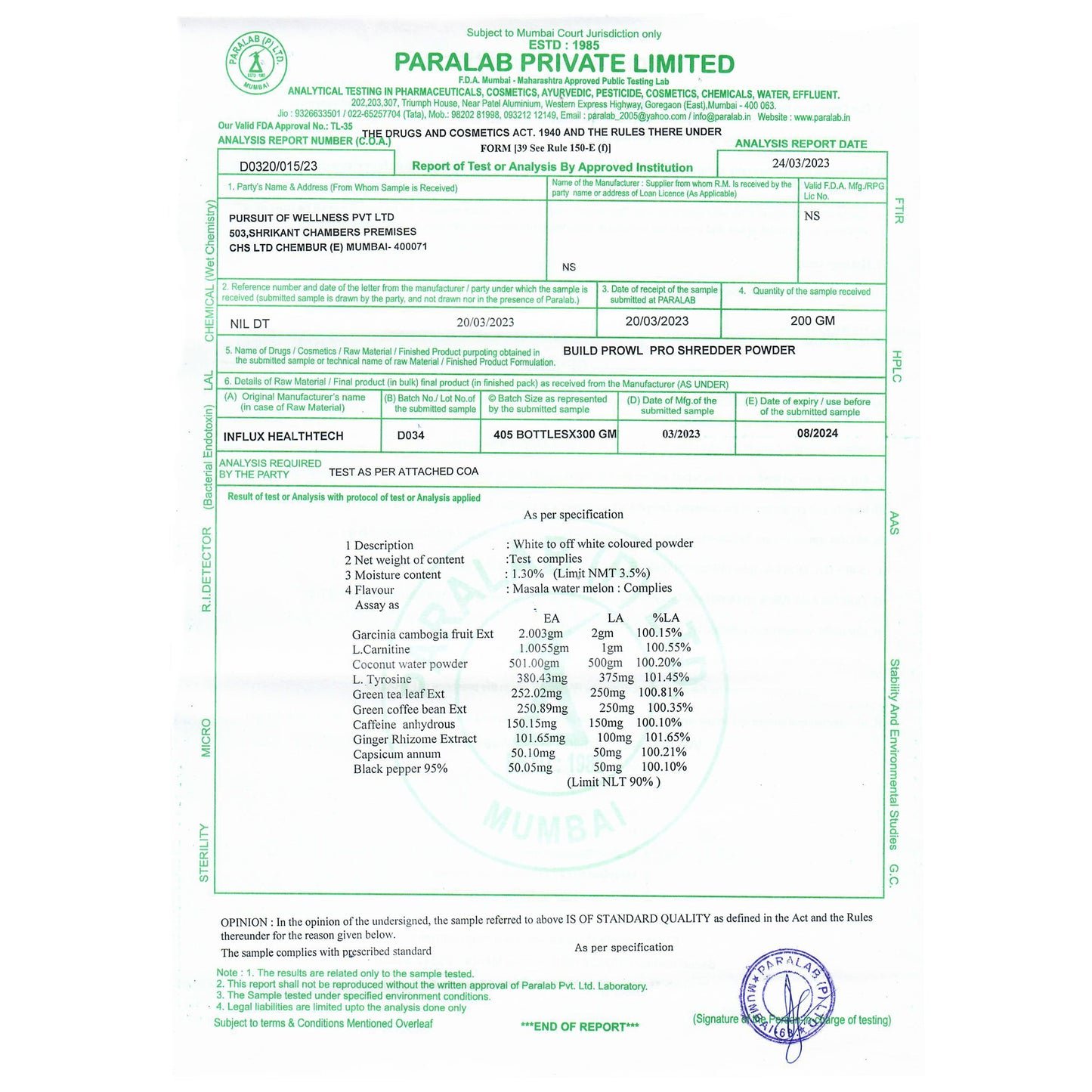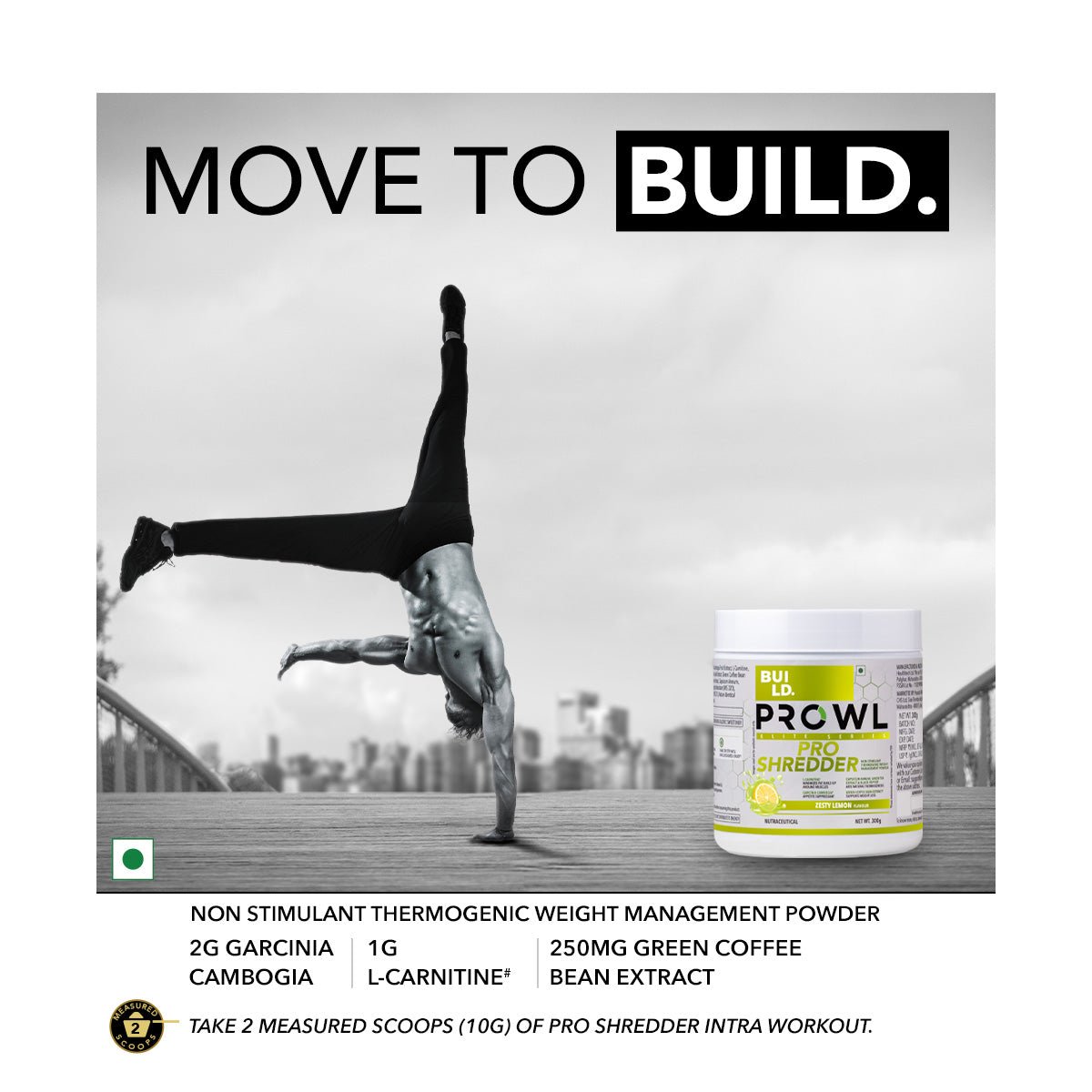 - BUILD. PROWL Pro Shredder, made with the finest combination of active ingredients that not only help in fat burn, but also helps promote improved metabolism. Garcinia Cambogia, L- Carnitine and Tyrosine help in converting fat to energy thus burning fat at faster rate. Combined with Green Coffee bean extract and Green Tea leaf extract it aids in faster and improved results. Presence of Coconut water powder in Pro Shredder helps to maintain normal electrolyte levels in the body.