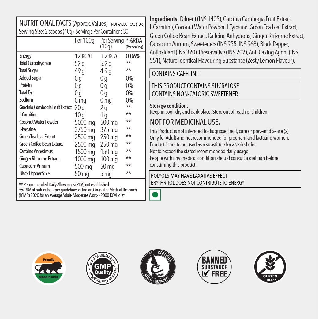 - 2g of Garcinia Cambogia that works as appetite suppressant and helps in faster fat loss.