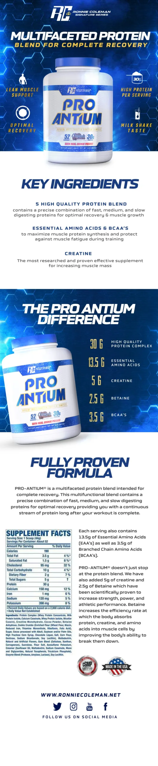 Ronnie Coleman Pro-Antium is a multifaceted protein blend intended for complete recovery. This