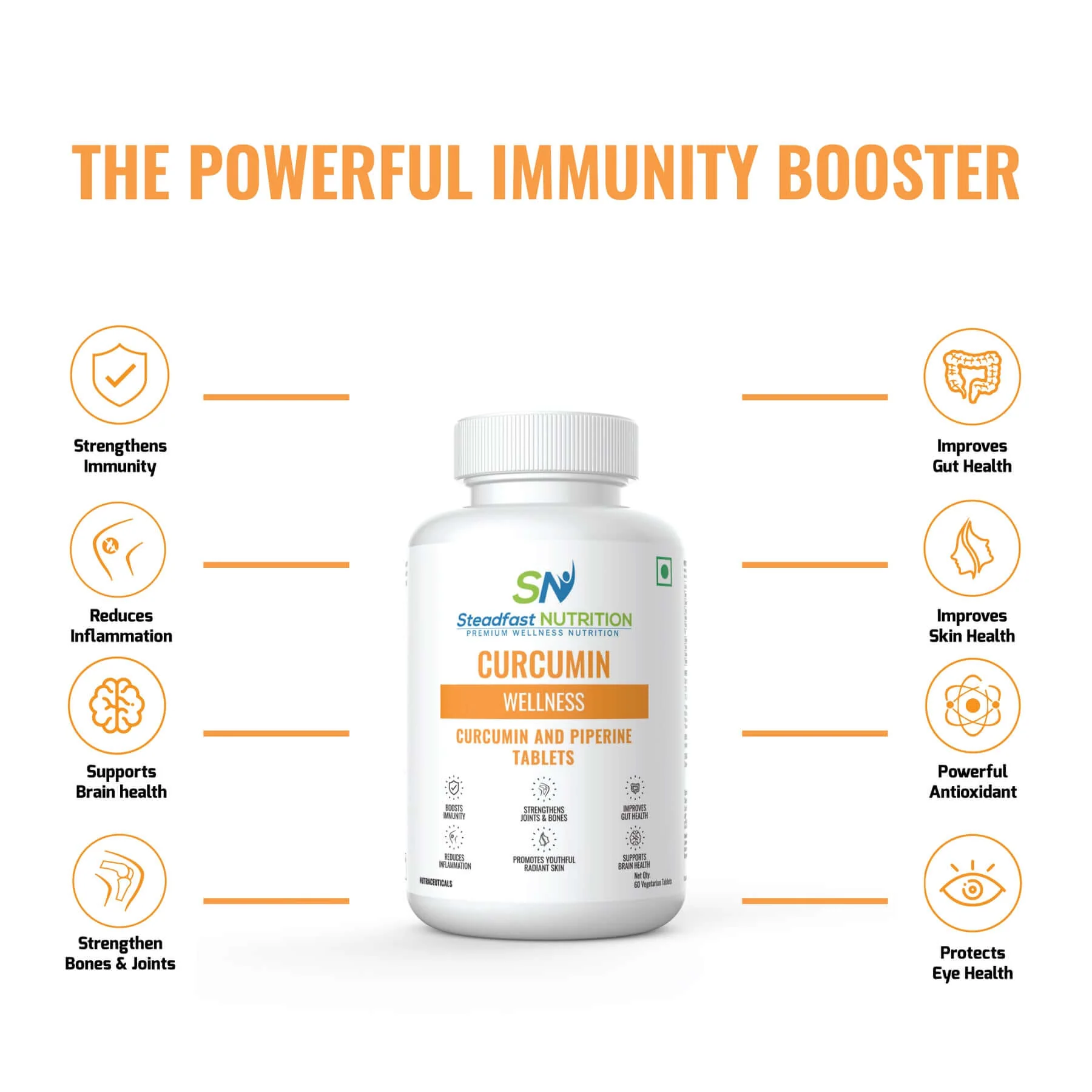 Steadfast Nutrition’s CURCUMIN provides 500 mg of curcumin and 5 mg of piperine, which helps boost immunity, reduce inflammation, improve bone and joint pain, boost skin, heart, and brain health, and maintain gut health.