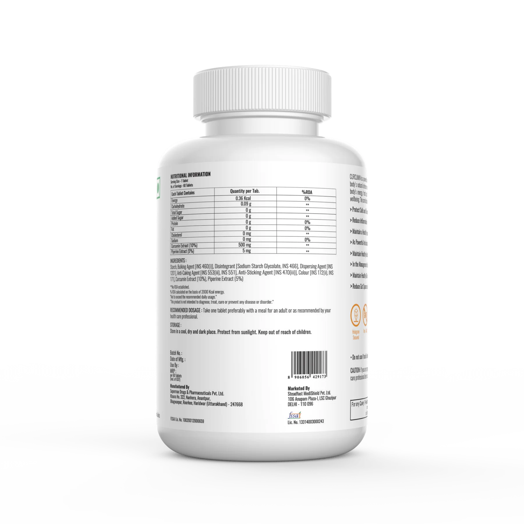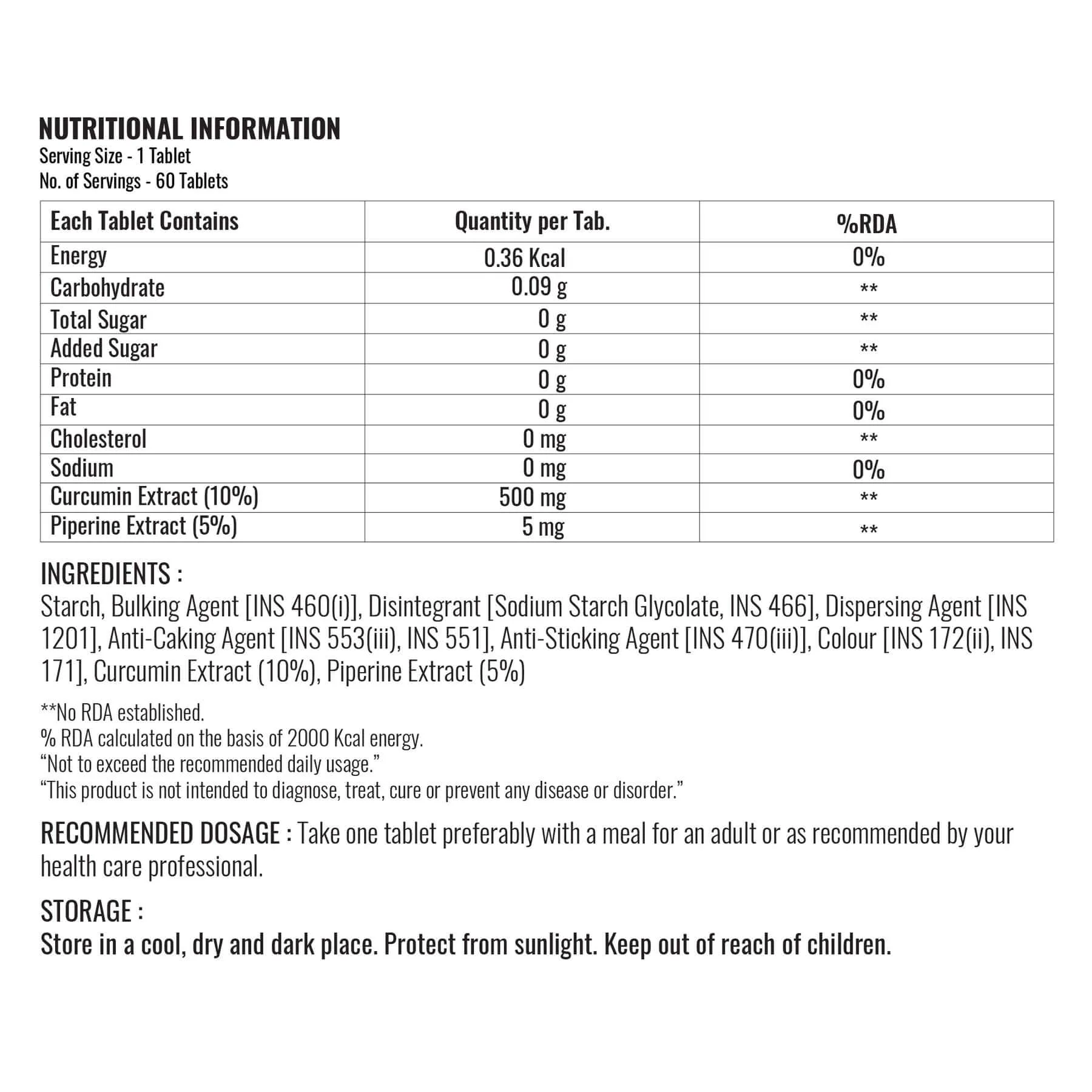 Curcumin Extract (10%), Piperine Extract (5%), Starch, Bulking Agent [INS 460(i)], Disintegrant [Sodium Starch Glycolate, INS 466], Dispersing Agent [INS 1201], Anti-Caking Agent [INS 553(iii), INS 551], Anti-Sticking Agent [INS 470(iii)], Colour [INS 172(ii), INS 171],