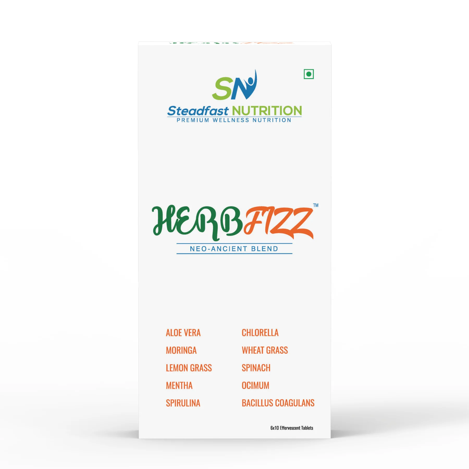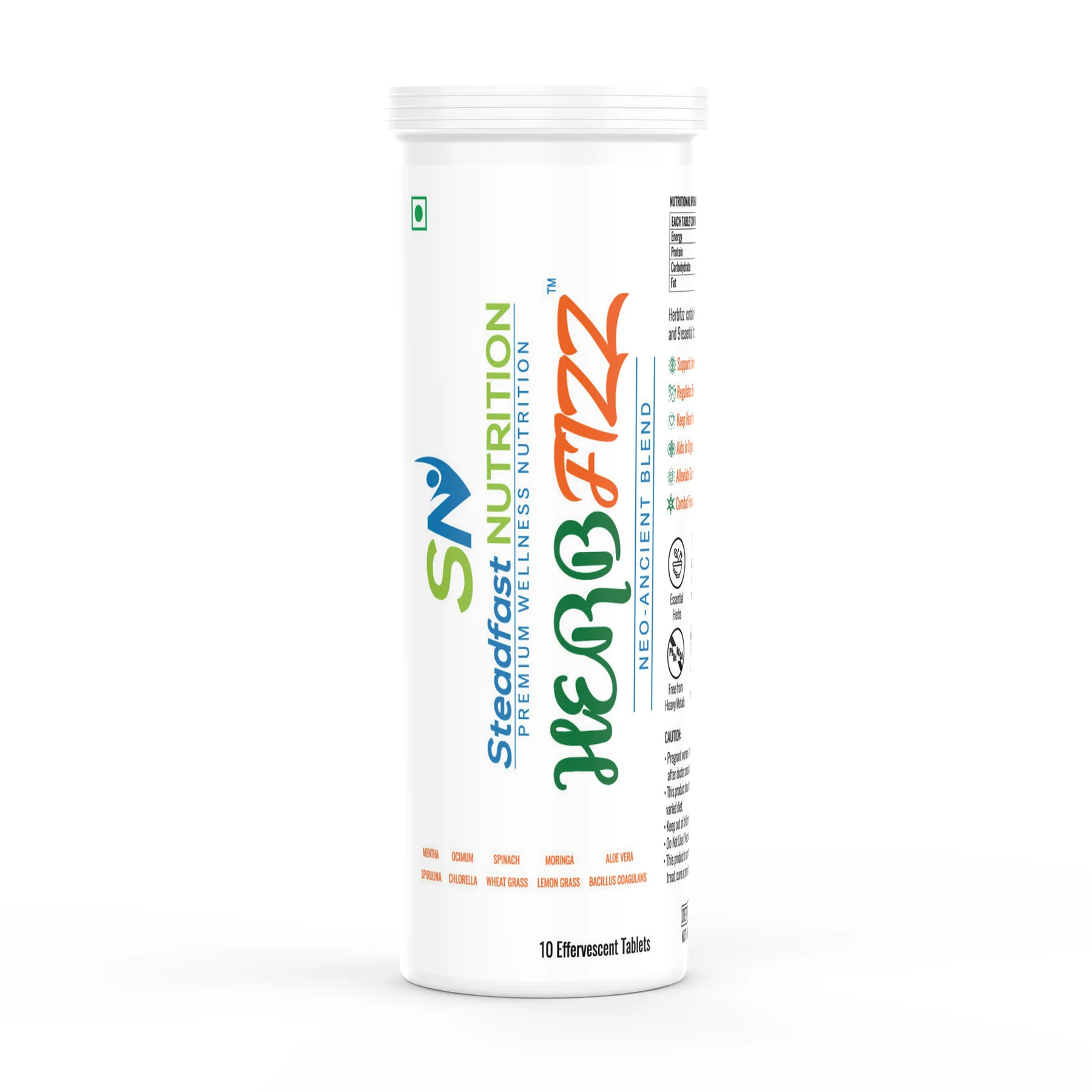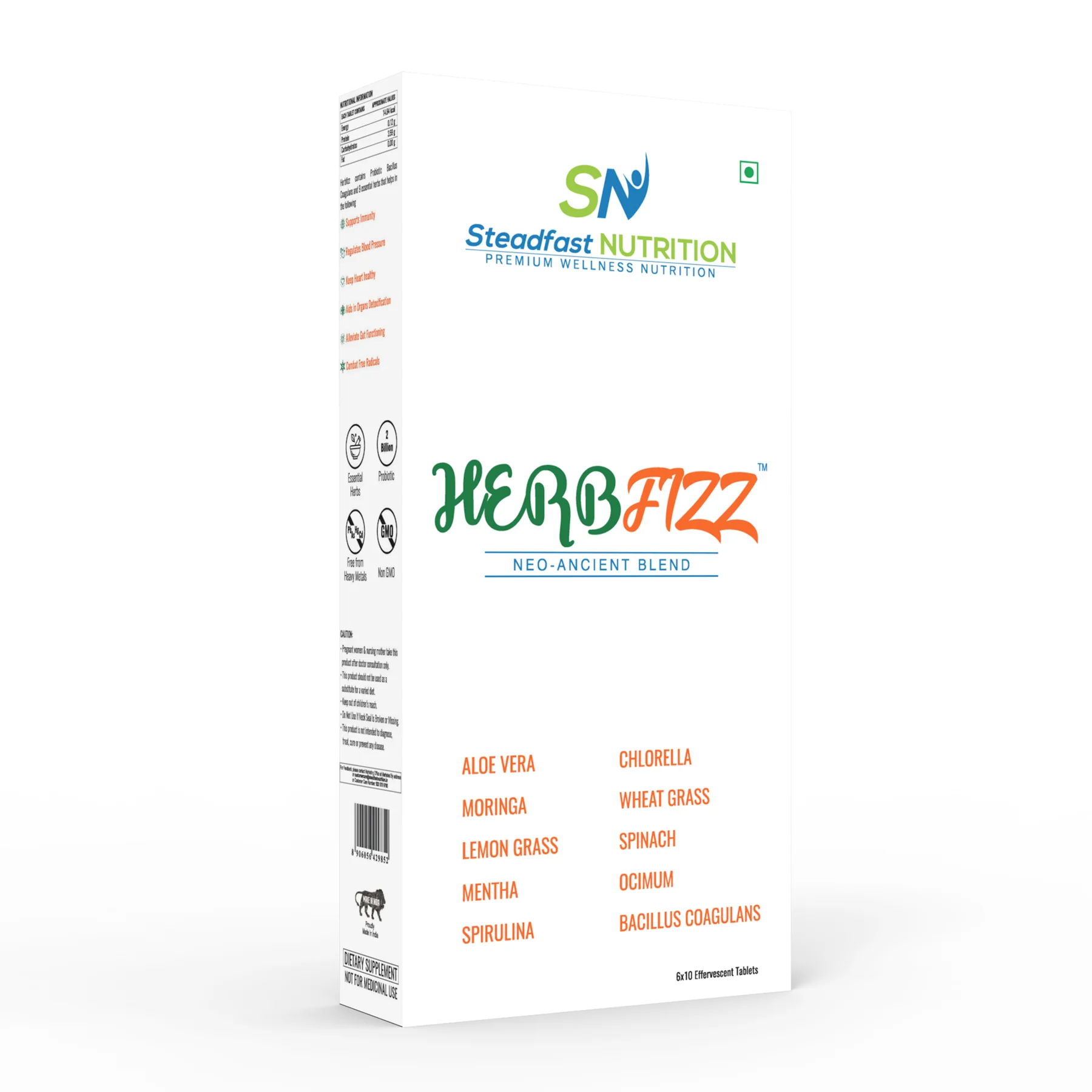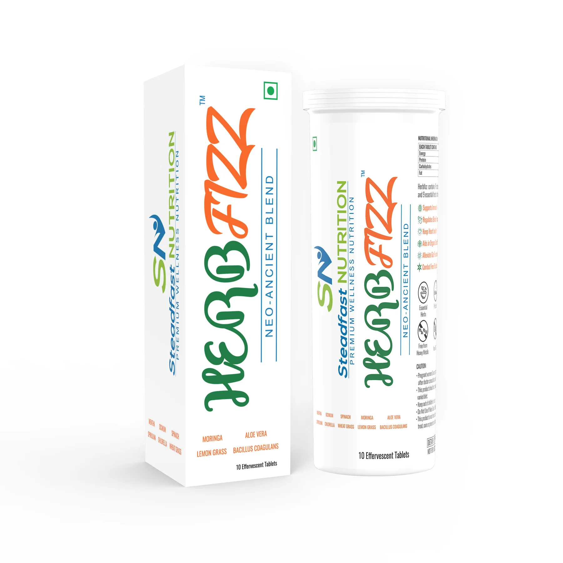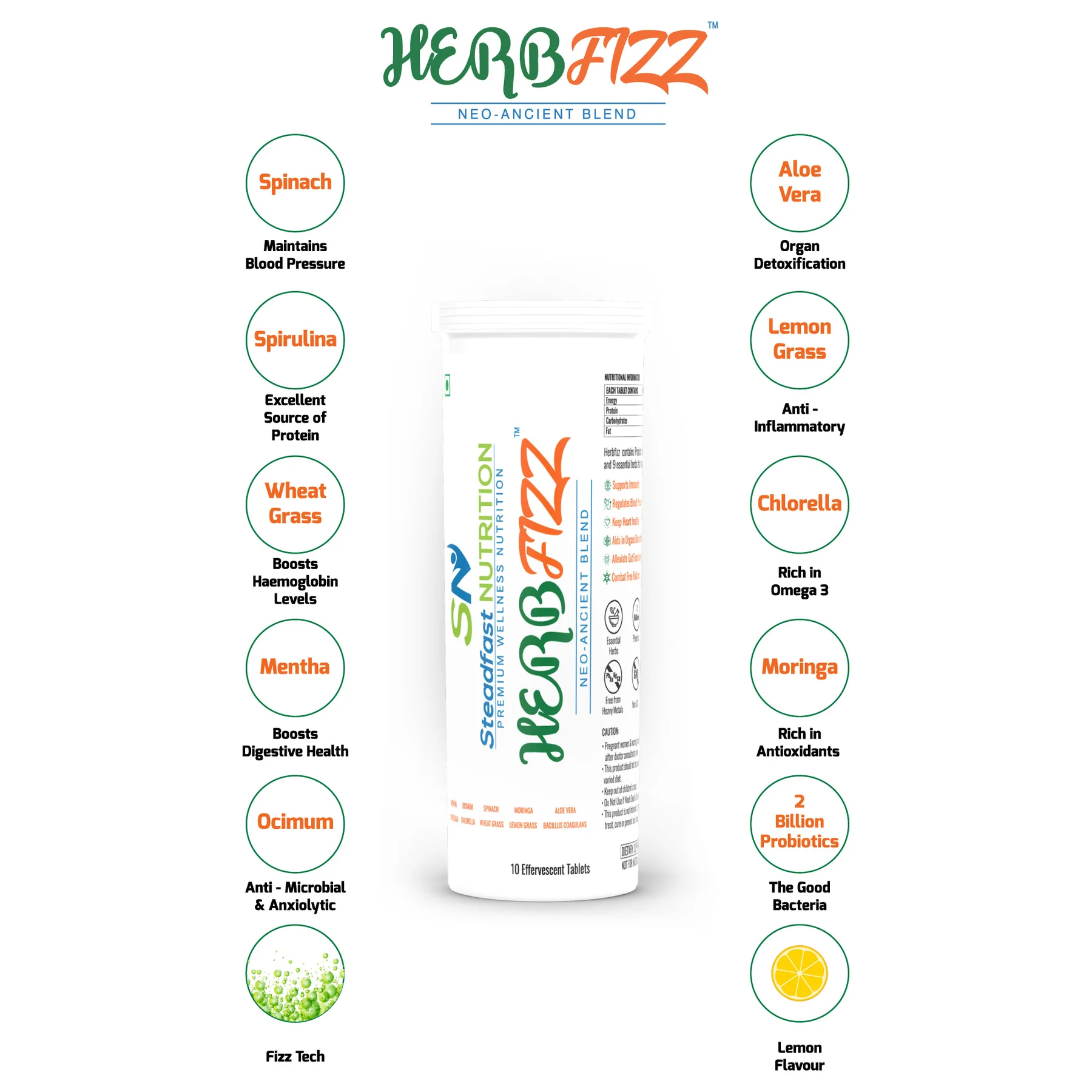 HerbFizz is a blend of nine organic herbs along with probiotics, to strengthen your digestive health in a delicious effervescence tablet. This neo-ancient blend contains Spinach, Aloe Vera extract, Ocimum, Wheatgrass, Chlorella, Lemongrass, Mentha, Moringa, Spirulina and Bacillus coagulans as probiotic.