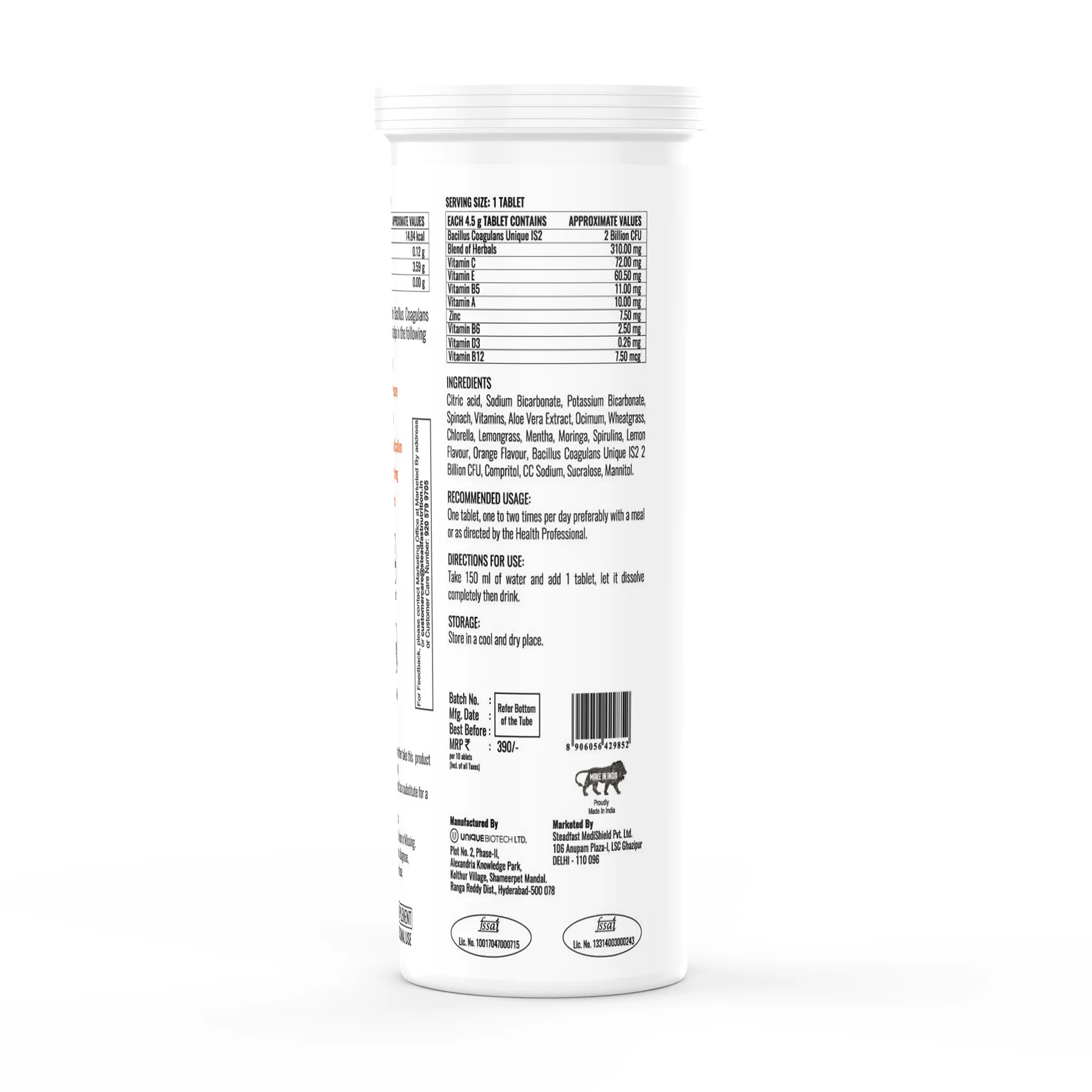 Citric acid, Sodium Bicarbonate, Potassium Bicarbonate, Spinach, Vitamins, Aloe Vera Extract, Ocimum, Wheatgrass, Chlorella, Lemongrass, Mentha, Moringa, Spirulina, Lemon Flavour, Orange Flavour, Bacillus coagulans Unique IS2 2 Billion CFU, Compritol, CC Sodium, Sucralose, Mannitol.