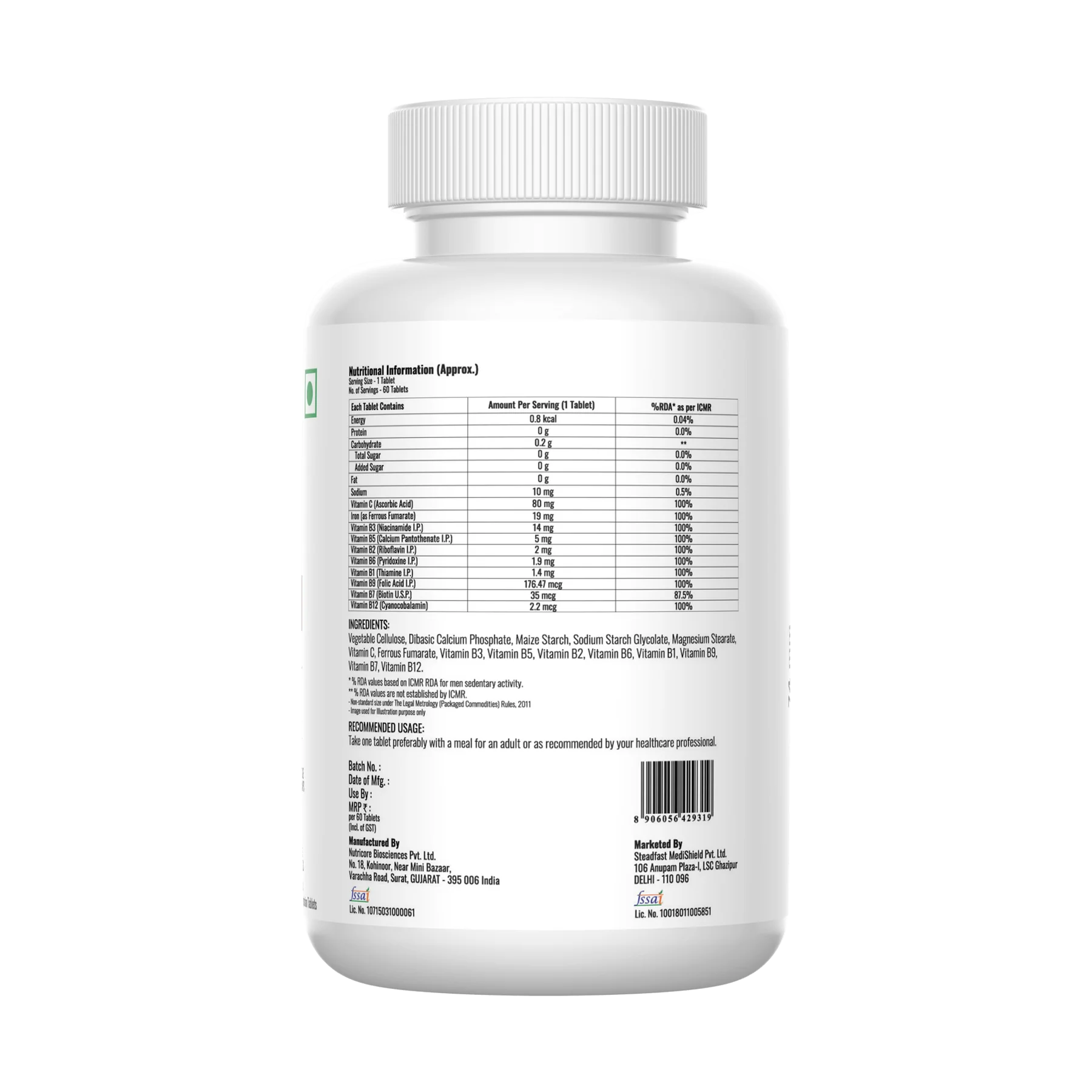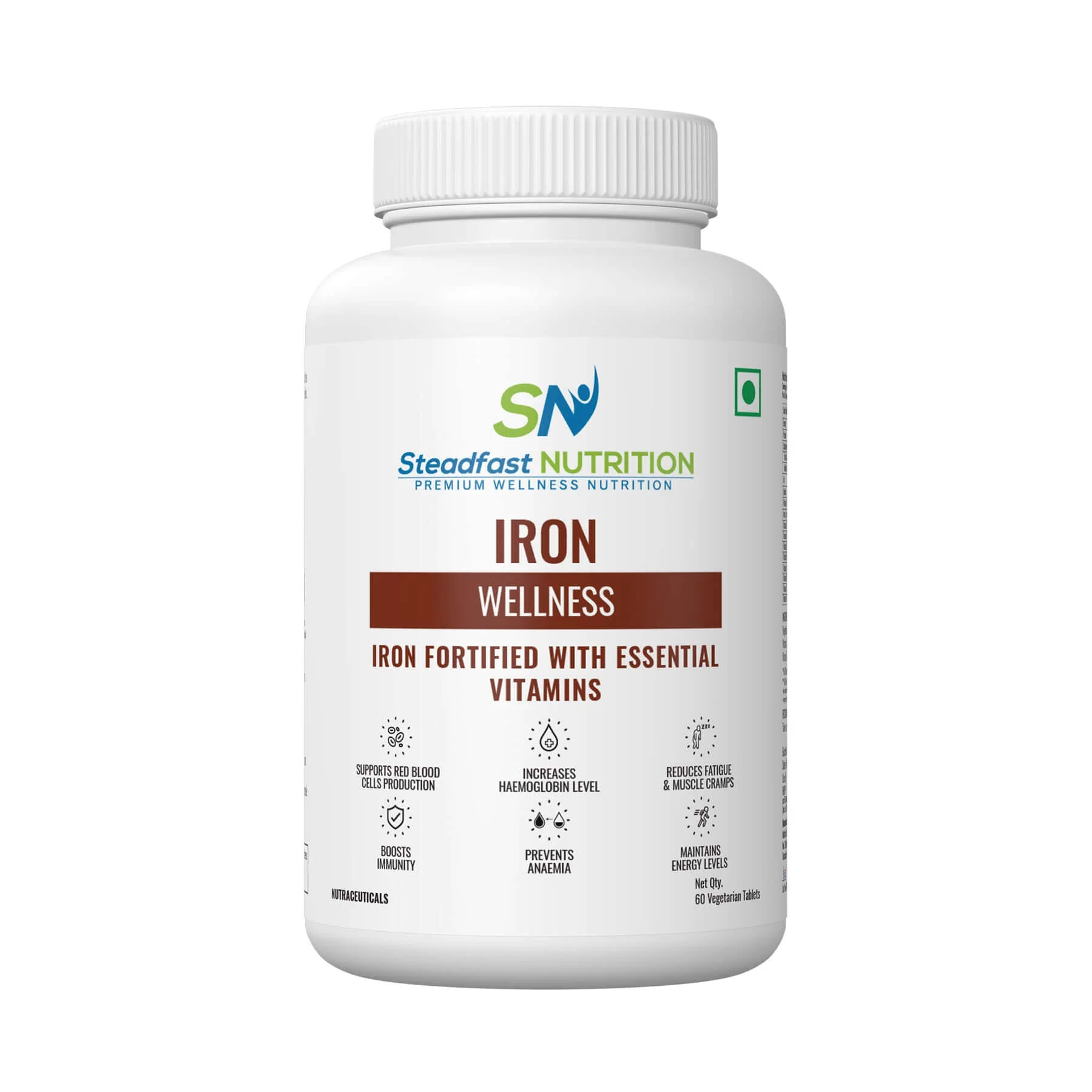 Steadfast Iron supplement is a great way to reverse iron deficiency and its resulting symptoms. It contains Iron as ferrous fumarate, Vitamin B1, Vitamin B2, Vitamin B3, Vitamin B5, Vitamin B6, Vitamin B7, Vitamin B9, Vitamin B12, and Vitamin C. All these ingredients work together in synergy to prevent iron-deficiency anaemia, reduce fatigue, boost haemoglobin, improve muscle endurance, and boost immunity.