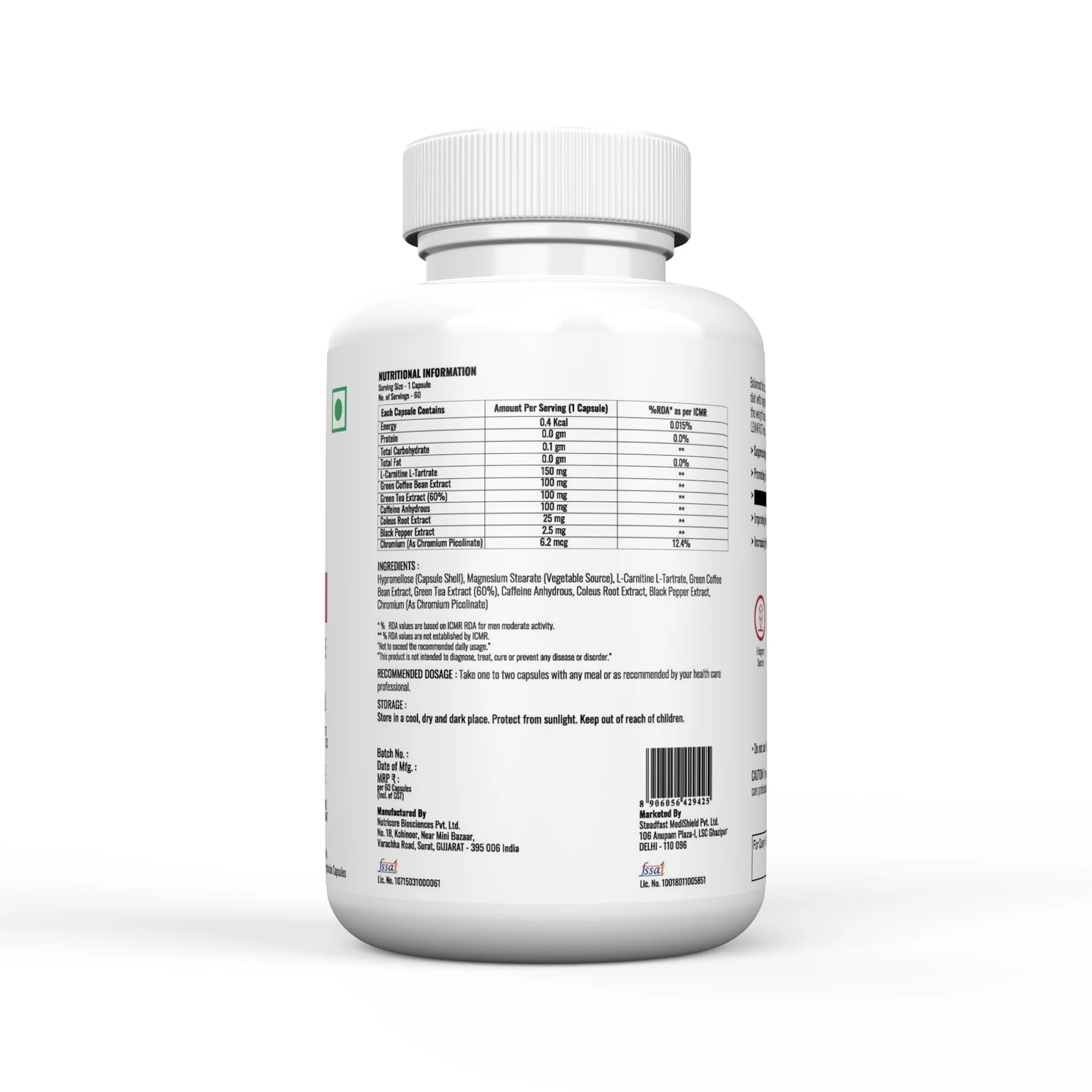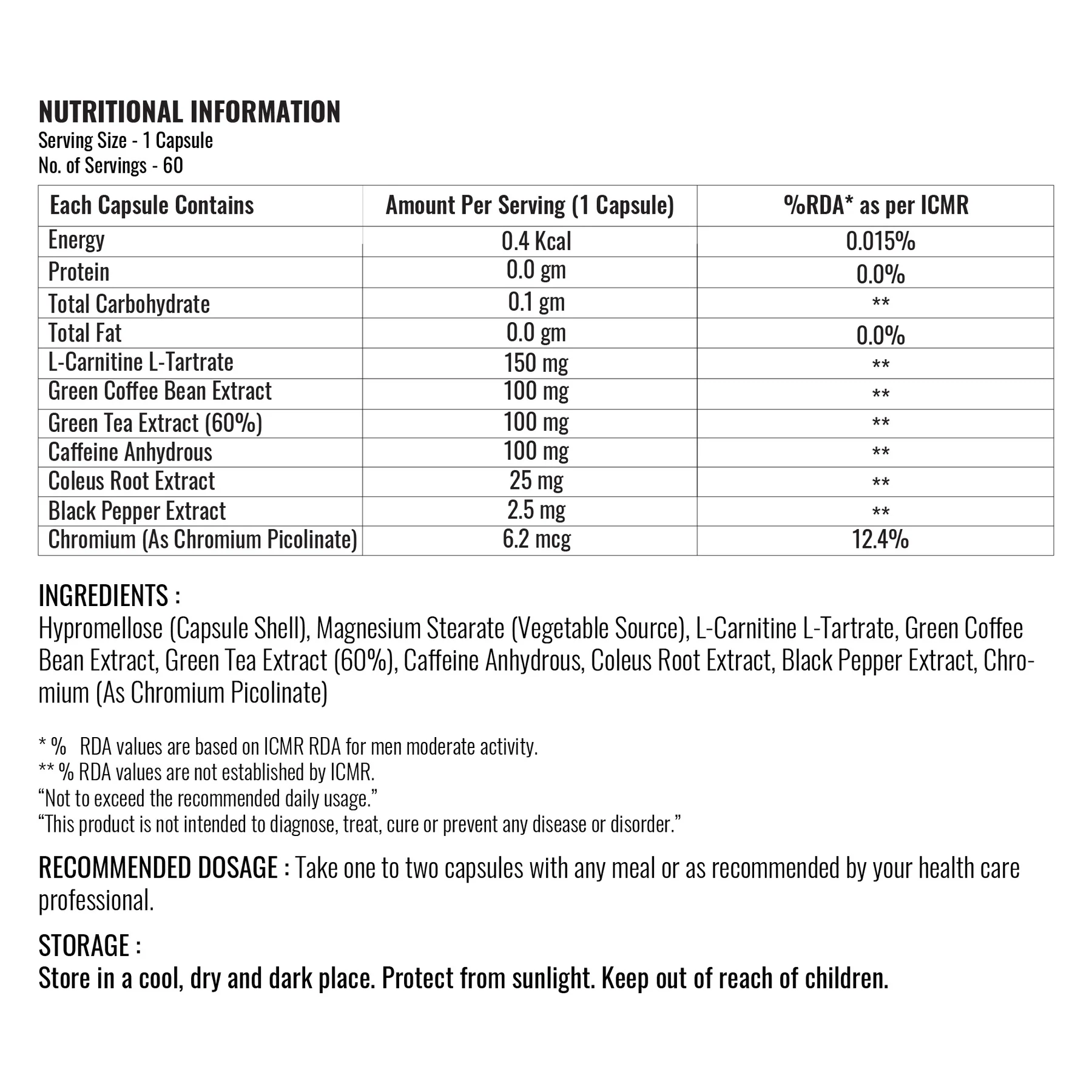 Hypromellose (Capsule Shell), Magnesium Stearate (Vegetable Source), L-Carnitine L-Tartrate, Green Coffee Bean Extract, Green Tea Extract (60%), Caffeine Anhydrous, Coleus Root Extract, Black Pepper Extract, Chromium (as Chromium Picolinate).