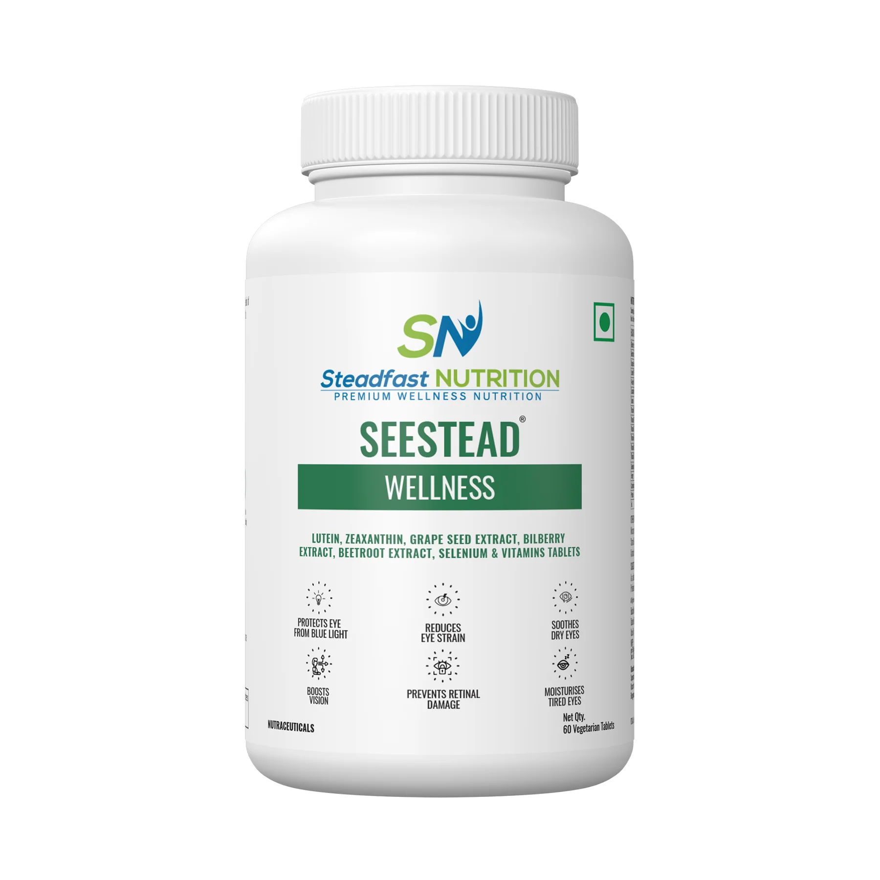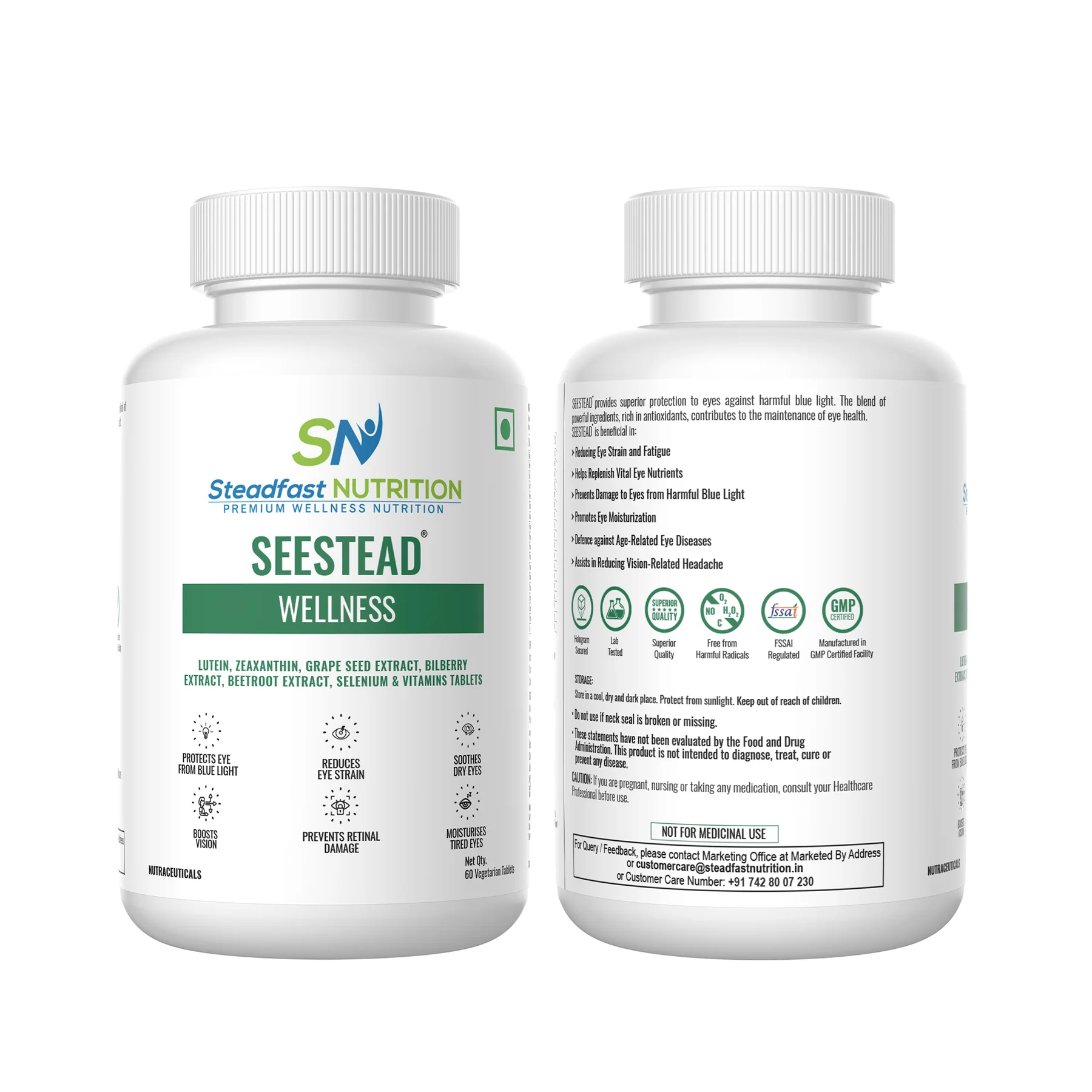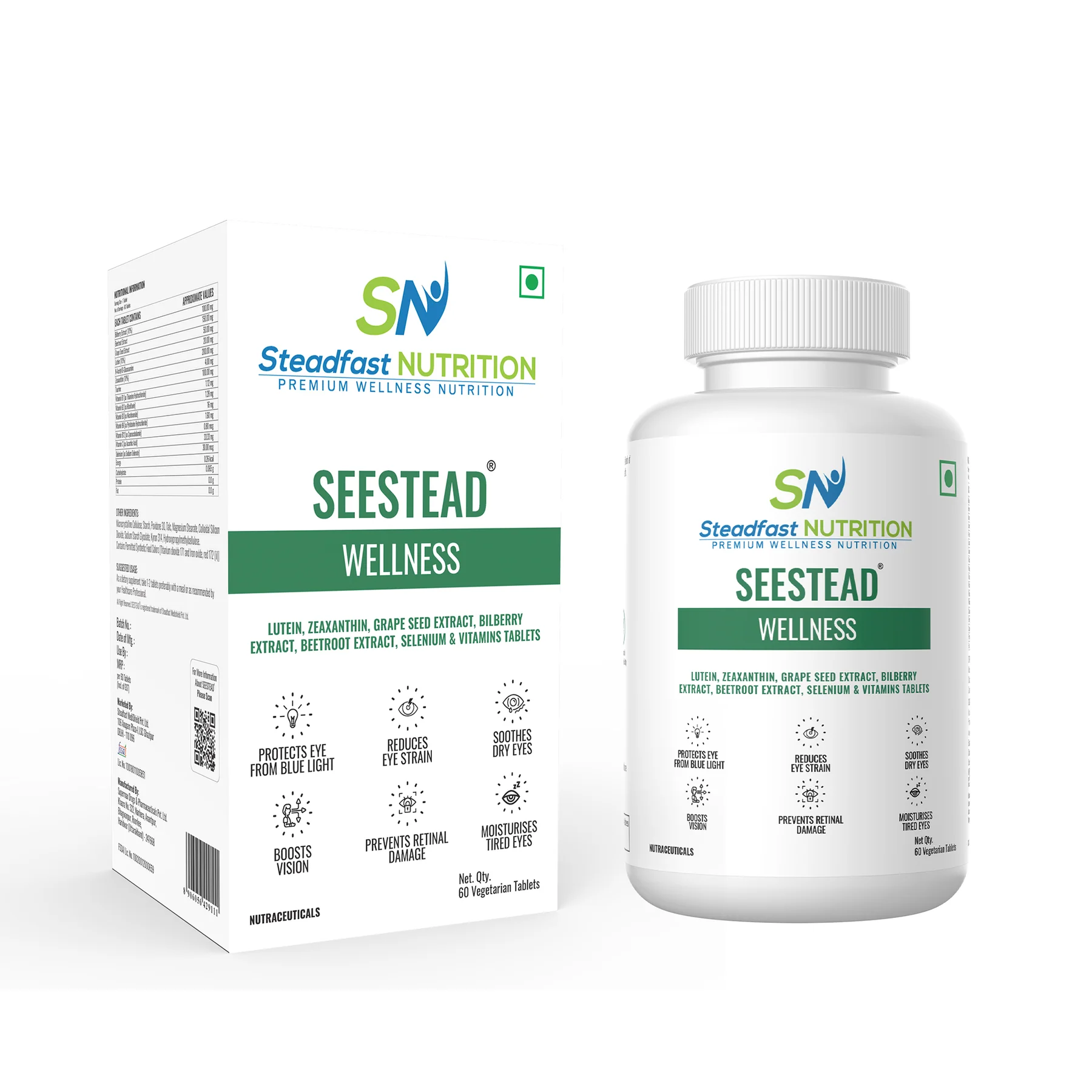 SEESTEAD® is an advanced nutritional formula comprising Lutein, Zeaxanthin, Bilberry Extract, Beetroot Extract, Grape Seed Extract, N-Acetyl D- Glucosamine, Vitamin C, Vitamin B1, Vitamin B2, Vitamin B3, Vitamin B6, Vitamin B12, Selenium, and Taurine, which work synergistically to maintain eye health by reducing eye strain, protecting eyes from the harmful effects of blue light and UV light, and boosting vision.