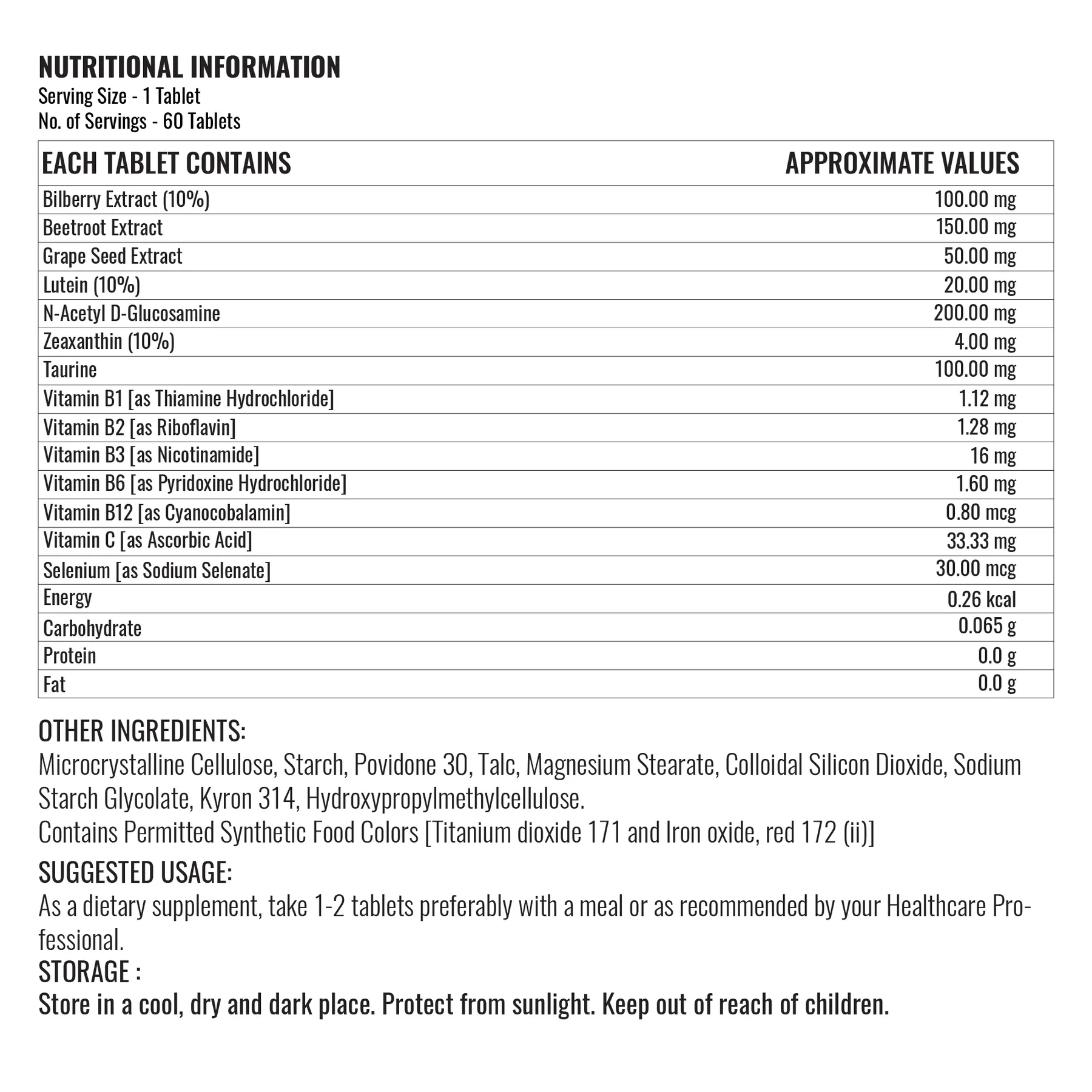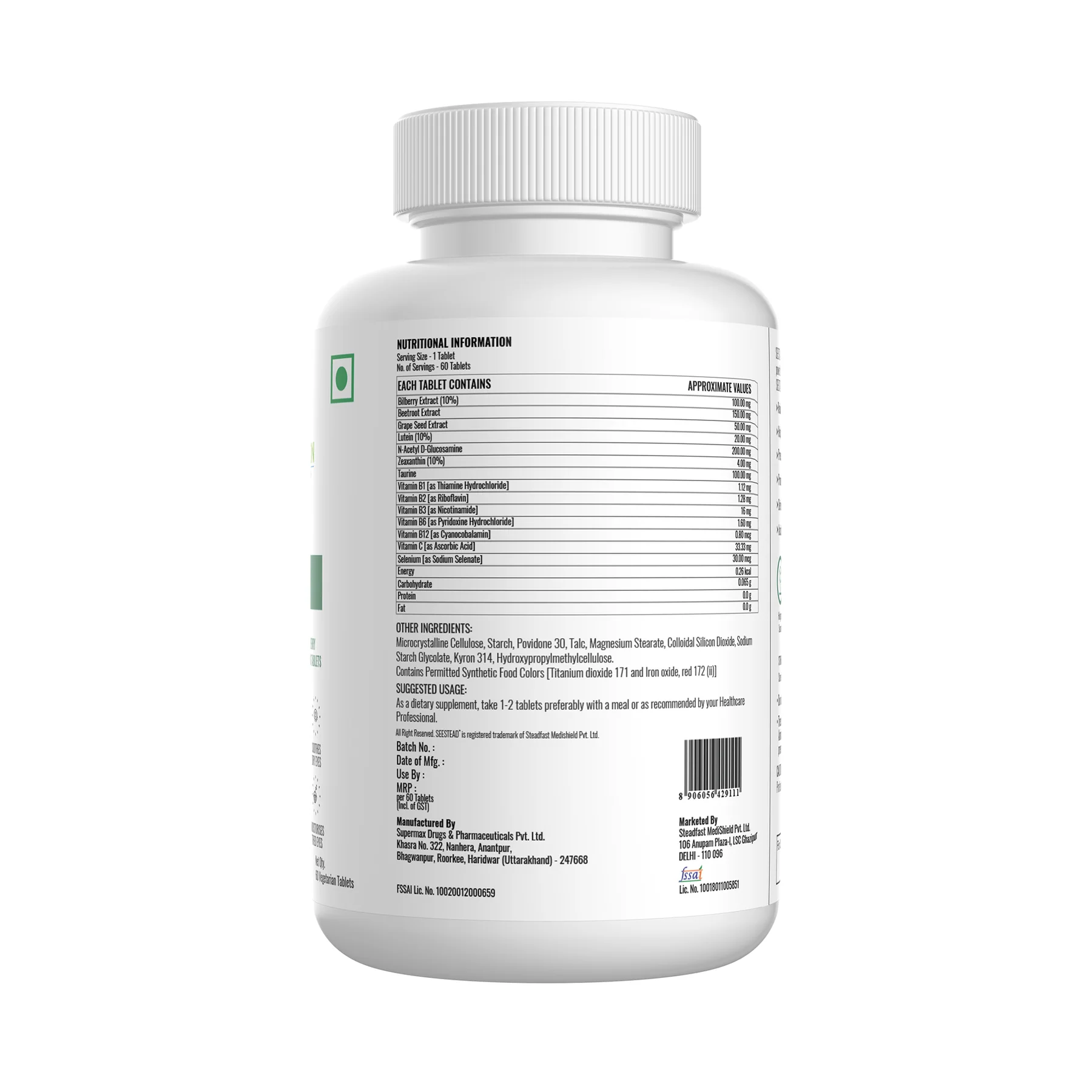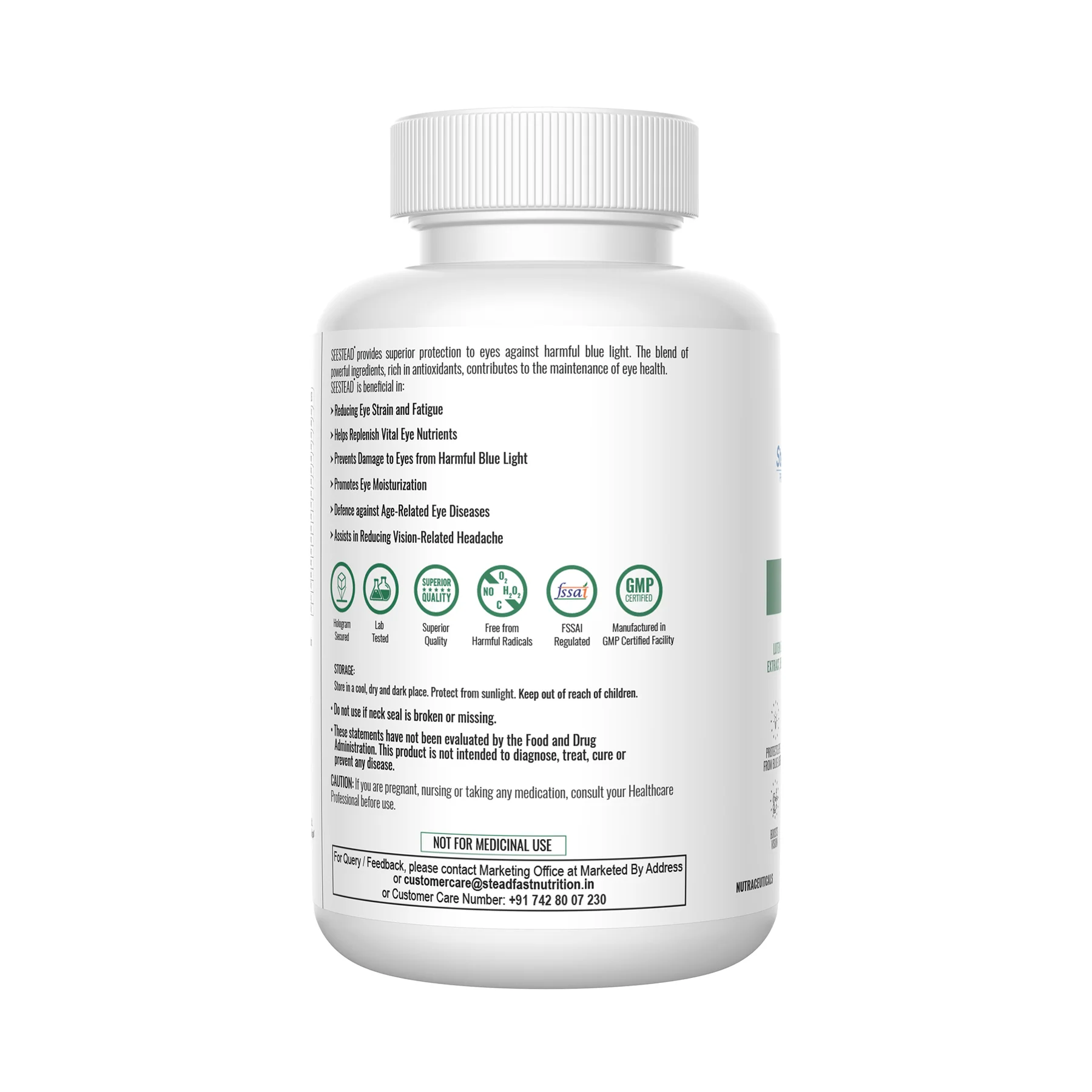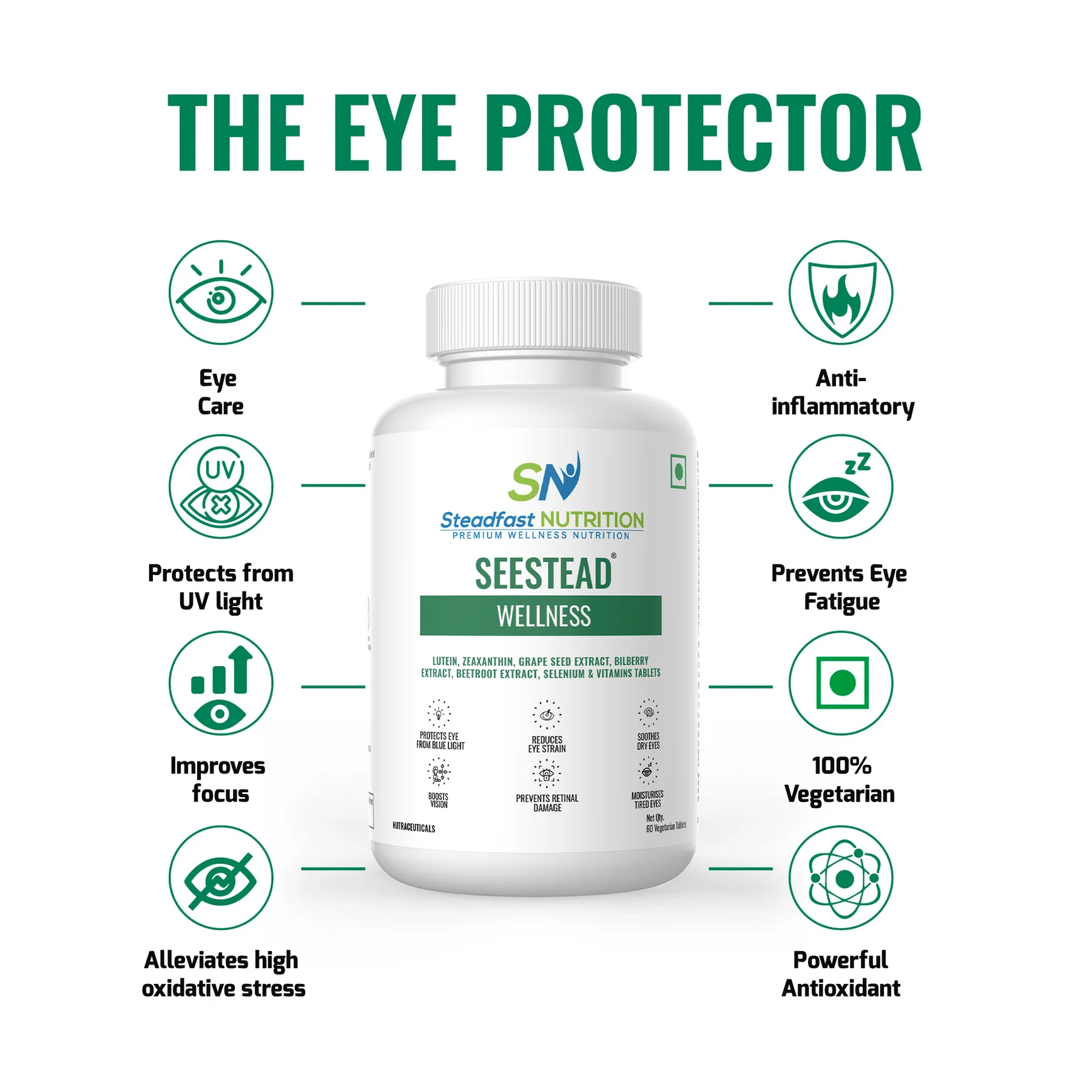 SEESTEAD® is an advanced nutritional formula comprising Lutein, Zeaxanthin, Bilberry Extract, Beetroot Extract, Grape Seed Extract, N-Acetyl D- Glucosamine, Vitamin C, Vitamin B1, Vitamin B2, Vitamin B3, Vitamin B6, Vitamin B12, Selenium, and Taurine, which work synergistically to maintain eye health by reducing eye strain, protecting eyes from the harmful effects of blue light and UV light, and boosting vision.