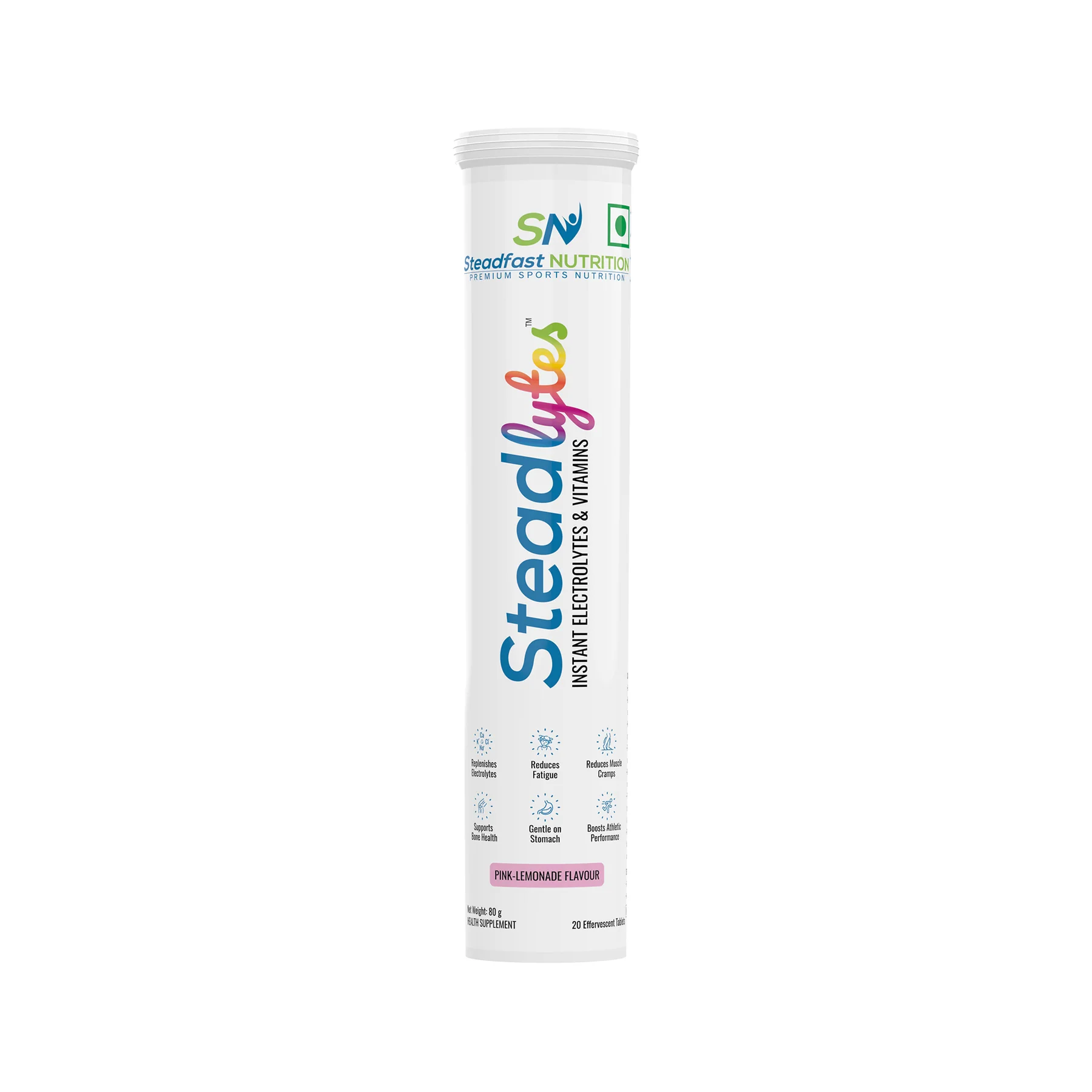 Steadlytesâ„¢ is an effervescent supplement that helps replenish lost electrolytes and provides instant hydration. It contains the electrolytes sodium, chloride, potassium, magnesium, and calcium, and Vitamins C and B12, which keep the body hydrated, reduce fatigue and muscle cramps, support bone health, and boost athletic performance. Steadlytesâ„¢ comes in an enticing pink-lemonade flavour.